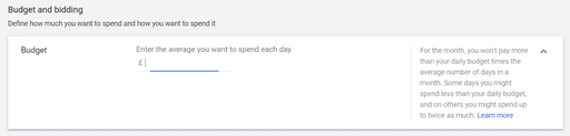 After submitting your business information, you’re able to explore your account and will be sent to a screen letting you know that the account creation has finished. However, inputting a budget is a crucial step in a Google Ad account setup. To do this, you will need to have created a campaign. During the first stage of campaign setup, you will be provided the option to enter your budget.