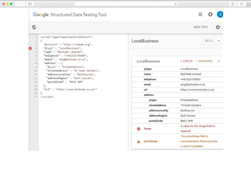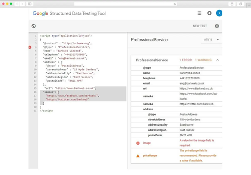 Firstly, the Google structured data testing tool I mentioned earlier. You can either enter a URL or copy and paste your code (which you should still have on your clipboard), into this testing tool. It will let you edit and correct faults as you go, and will outline any errors you are currently experiencing. It also displays suggestions if you aren’t sure about the spelling of any of your code and want to input it manually. This tool should be second nature to you by now if you have followed the advanced section of this tutorial.