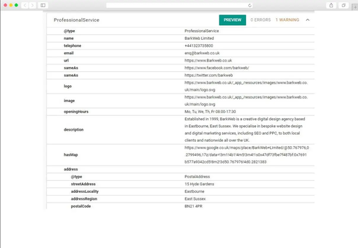 18. After adding the finishing touches of the company logo (and copying it over as an “image” data subset), the opening hours and description, test your code one last time. If no errors are showing, then your JSON-LD Script is ready to implement! It should look a little something like this;
