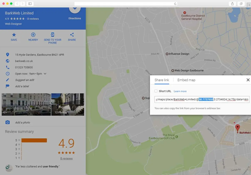 15. Next, we are going to focus on localizing your business. For BarkWeb, we are going to use the metrics ‘Longitude’ ‘Latitude’ and Google Maps. To access this information, type in your company address into Google Maps, and click ‘Share’.